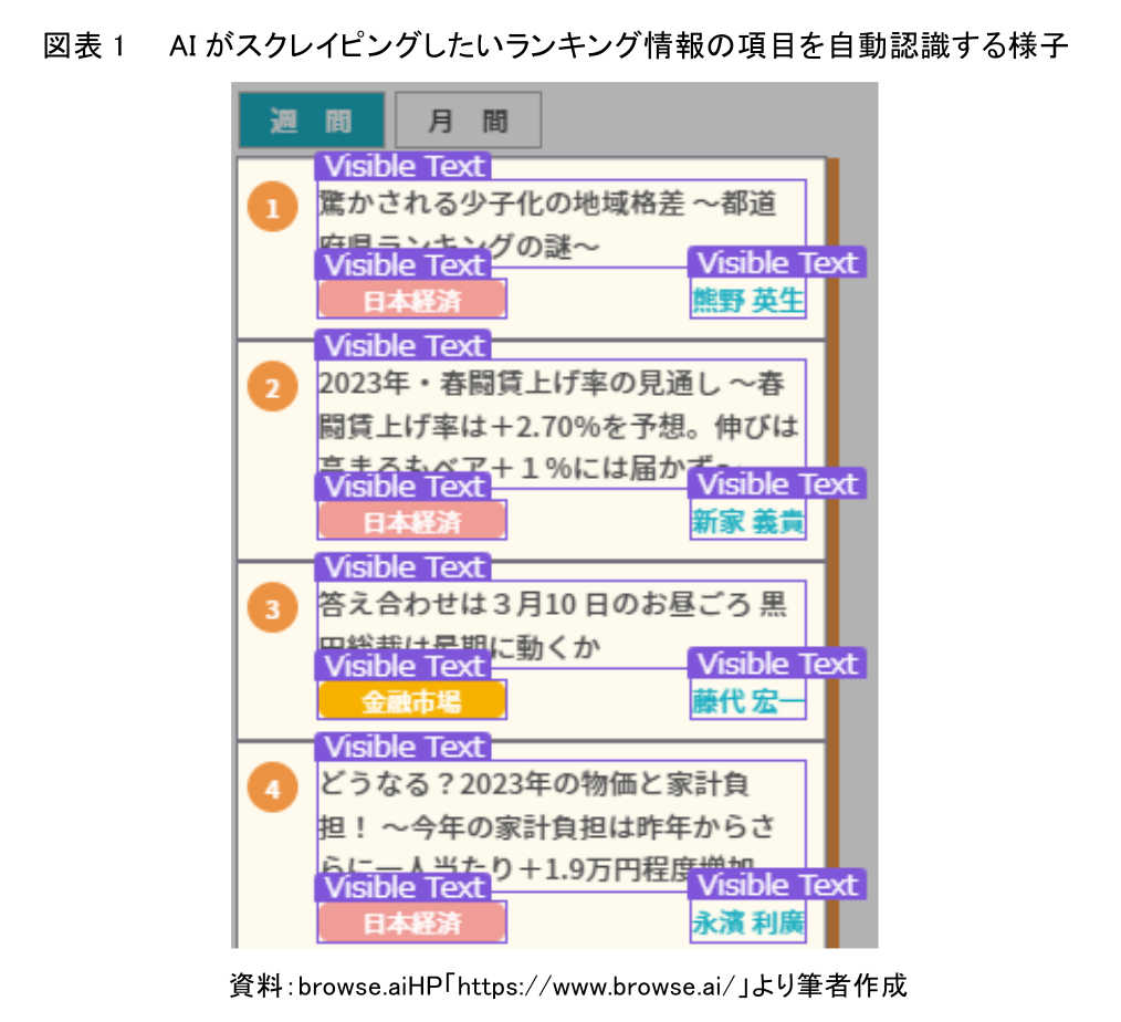 まず、当社ホームページの「レポートランキング情報」を題材として、ウェブスクレイピングAIの性能を検証してみた。ウェブスクレイピングAIを使えば、プログラミングのコードは必要がなく、マウス操作とテキスト入力作業だけでスクレイピングを実行できる。ウェブスクレイピングAIを起動させ、スクレイピングの対象となる当社のホームページのURLを指定する。その後、今回スクレイプングしたいウェブ上の場所となる週間ランキンングの欄を範囲選択する。そして、週間レポートランキングに表示されているタイトル、カテゴリ、発信者にそれぞれカーソルをフォーカスさせると、ウェブスクレイピングAIは、それぞれの対象を自動認識してくれる(図表1)。