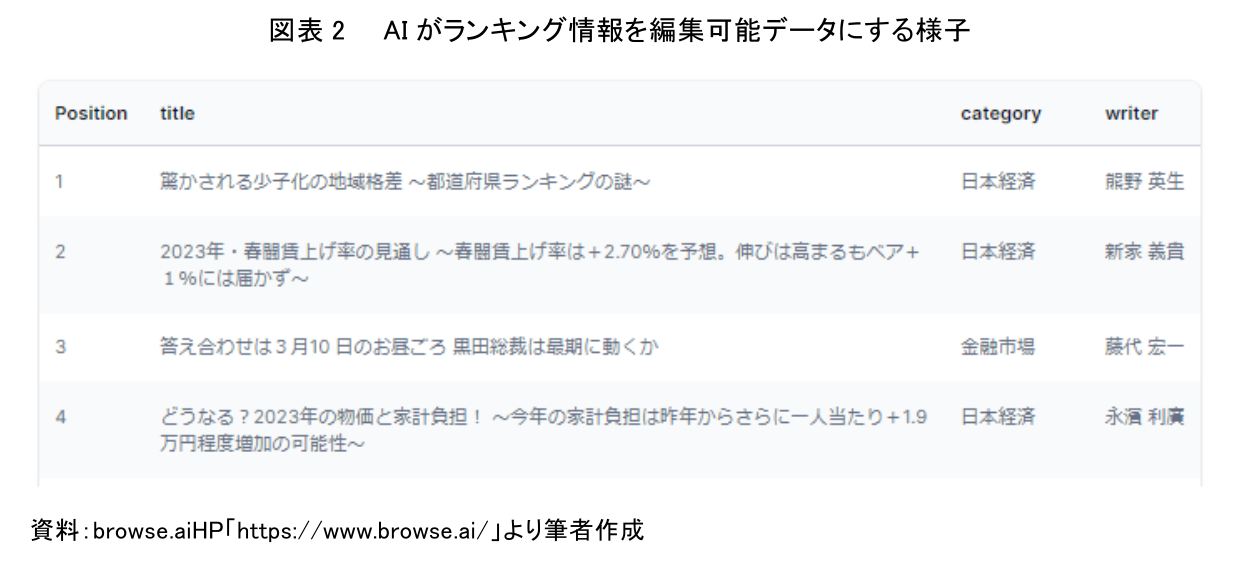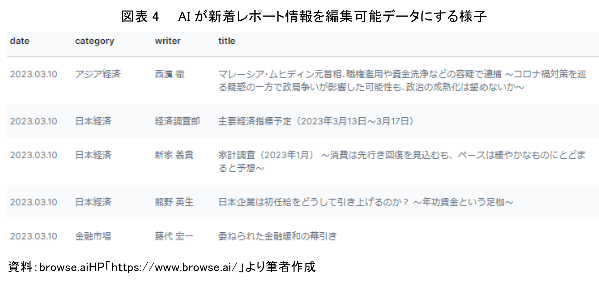 データ生成の対象として認識された情報には、テキストを入力できるポップアップが表示されるため(図表3のVisible Text)、付与したいタグ名を記入すればよい。今回の新着レポートに関してウェブスクレイピングAIが認識した情報に対して、date(日付)、category(カテゴリ)、writer(発信者)、title(タイトル)を入力している。その後、ウェブスクレイピングAIの生成機能を発動させれば、AIは瞬時にワードやエクセルのようなソフトウェア上で並べ替えたり、加工できる編集可能データを生成してくれる(図表4)。