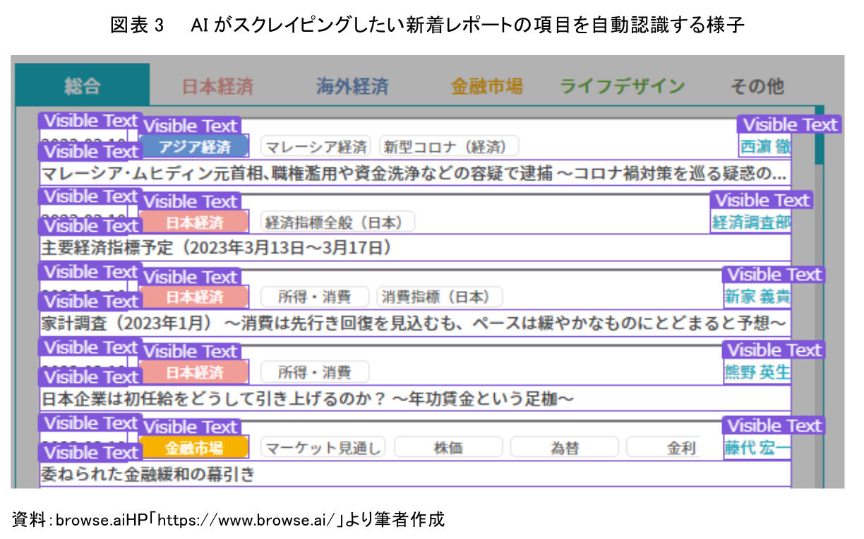 次に、日々発信される「新着レポート情報」についてもウェブスクレイピングAIを動作させ、その性能を検証してみた。当社ホームページに掲載される新着レポートのウェブページ上でウェブスクレイピングAIを起動させる。その後、今回スクレイピングしたいウェブ上の新着レポート欄に表示されている日付、カテゴリ、筆者、タイトルにそれぞれカーソルをフォーカスさせると、ウェブスクレイピングAIは、それぞれの対象を自動認識してくれる(図表3)。
