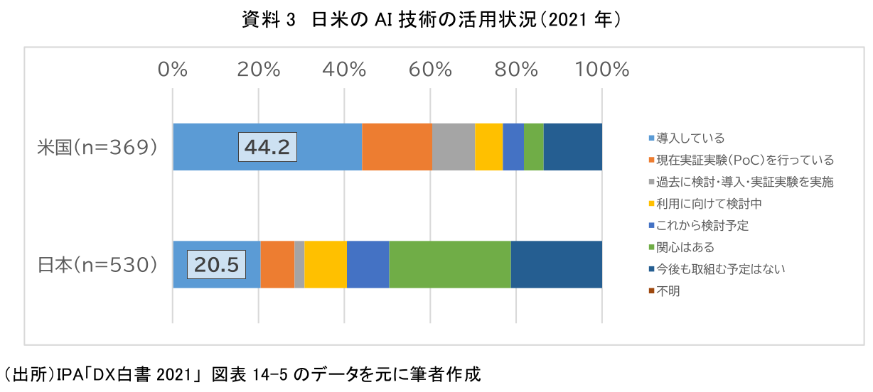 次に事例についても確認していく。前節で述べたようにAIのサービス利用が広がる一方、問題も出始めている。例えば、米国の先進的なIT企業によるAIを活用した人材採用システムが女性を差別していたことが発覚し、2017年にプロジェクトが終了した。また2019年に米国の別の先進IT企業が提供するクレジットカードのAIを活用した審査において、与信スコアは妻の方が高いにも関わらず、夫が妻より20倍高い利用限度額が設定されていたことが、カード利用者のSNSへの書き込みによって発覚した事例などが存在する。日本において、レポート執筆時点では「AIの公平性」に直結する事例で目立ったものは存在しないが、ここで考慮したいのは、テクノロジーが浸透していくスピードにおいて、日本は欧米を追従するという点である。資料3は日米におけるAI技術の活用状況の比較である。AIを導入している企業の割合をみると、米国企業が44.2%と、日本企業の20.5%を大きく上回っていることがわかる。今後、日本でも米国並みにAI活用が進むと、米国で先行したような事例が日本でも起こる可能性は十分にあるといえるだろう。