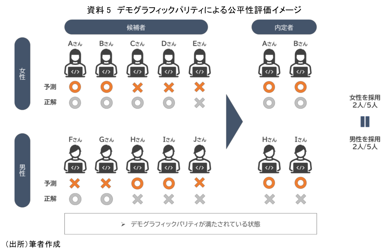 デモグラフィックパリティを端的に説明すると、「グループごとの予測の比率が同じであるほどよい」という指標である。例示のケースでみていくと、性別ごとの予測の比率が近いほどよいので、男性2名、女性2名を採用すると予測できれば、公平性があると評価される。