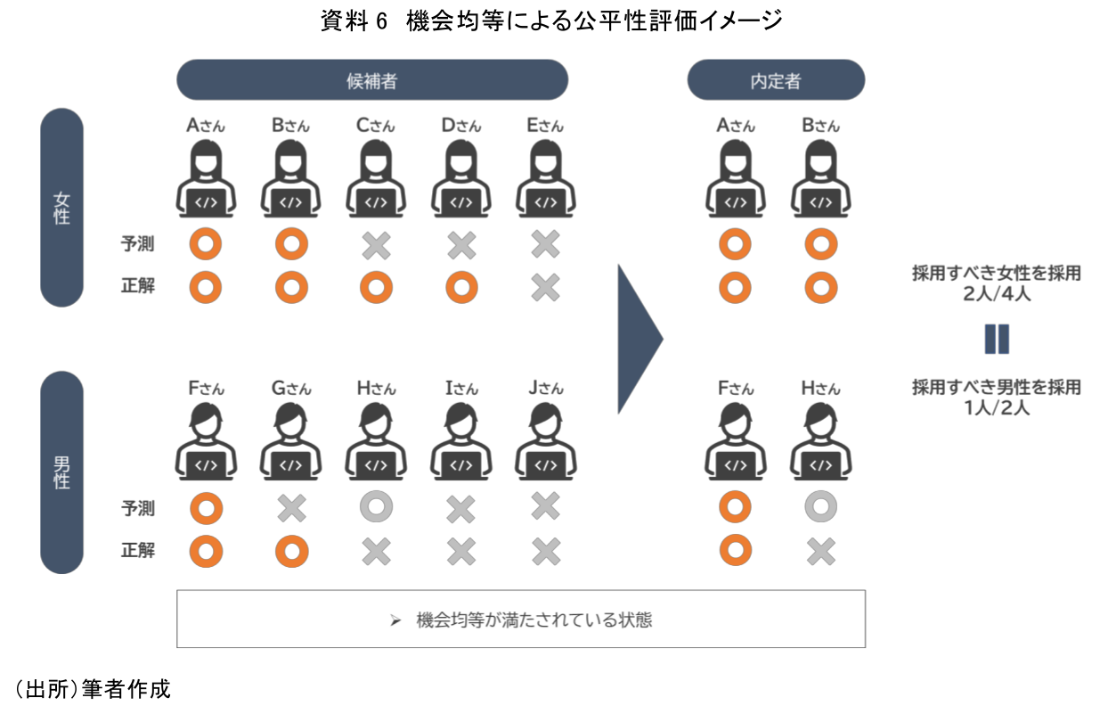 機会均等を端的に説明すると、「グループごとの正解に対して予測の比率が等しいほどよい」という指標である。例示のケースだと、本来採用すべき人(正解)が女性は4名、男性は2名いた場合、AIがその中から女性2名、男性1名を予測した状態で、男女のグループ間で同じ比率となり、公平性があると評価される。前述のデモグラフィックパリティのケースでは、AIの予測結果のみが評価の対象であるため、極論すると精度を考えずにセンシティブ項目が平等になるように予測するようなAIを作ればデモグラフィックパリティを満たすことができた。それに対し、機会均等は、本来権利を有するべき人が、公平に扱われているかどうかを見ることができる指標であるため、精度も意識しつつ公平性も評価できるといえるだろう。