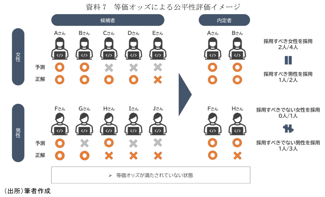 等価オッズを端的に説明すると、「グループごとの正解と不正解に対して予測の比率が等しいほどよい」という指標である。例示のケースに当てはめると、まず本来採用すべき人(正解)の男女の比率については、前述の機会均等で確認したように同じ比率になる。一方、本来採用すべきでない人(不正解)をみると、女性は1名、男性は3名存在しているのに対し、AIはその中から女性0名、男性1名を予測しており、男女のグループ間で差異があるため、等価オッズを満たしていないといえる。このように等価オッズは、機会均等に比べて公平性という意味ではより厳格な指標であるといえる。