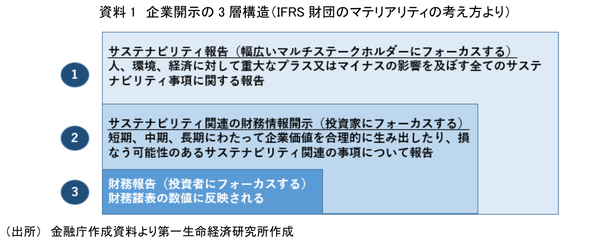 IFRS(国際財務報告基準)財団によれば、企業によるサステナビリティに関する開示は資料1のように3層構造とされる。