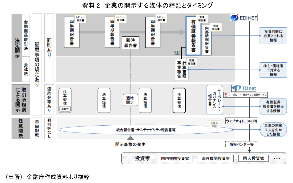 媒体としては金融商品取引法に基づく有価証券報告書が基礎となるが、その他にもそれぞれの目的に応じて、法定開示、取引所規則による開示や任意開示の媒体がある。どのような媒体がどのタイミングで何に基づいて提出されるのかを示しているのが、資料2となる(注2)。法律や取引所規則といったルールに基づいた開示には記載事項についての規程があり、それに反した場合にはペナルティが課せられる。任意開示での記載は企業の自由であり、罰則はない。