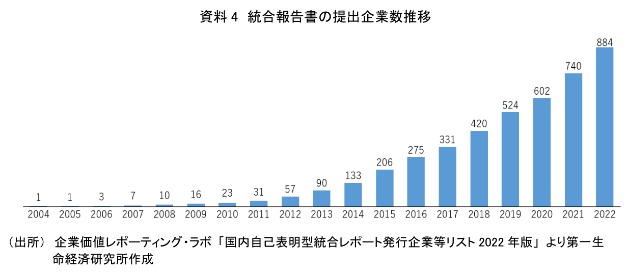 2010年頃以降、この統合報告書を開示する企業が着実に増加している(資料4)。このような動向は、財務情報の開示だけでは企業の持続的成長を評価してもらうことが困難と考える企業が増加していることを示している。