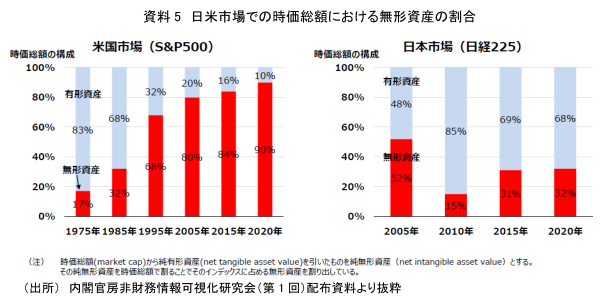 また、米国市場(S&P500)と日本市場(日経225)の時価総額における無形資産の割合を比べると(資料5)、時価総額が圧倒的に大きく、且つ増大している米国市場においては時価総額に占める無形資産の割合が年々増加し、2020年では9割を占める状況となっている。無形資産の評価では非財務情報による部分が大きく、企業価値評価において非財務情報が大きな意味を有していることを示しており、我が国においてもこれをより重視し、充実させていくべきことを示唆している。