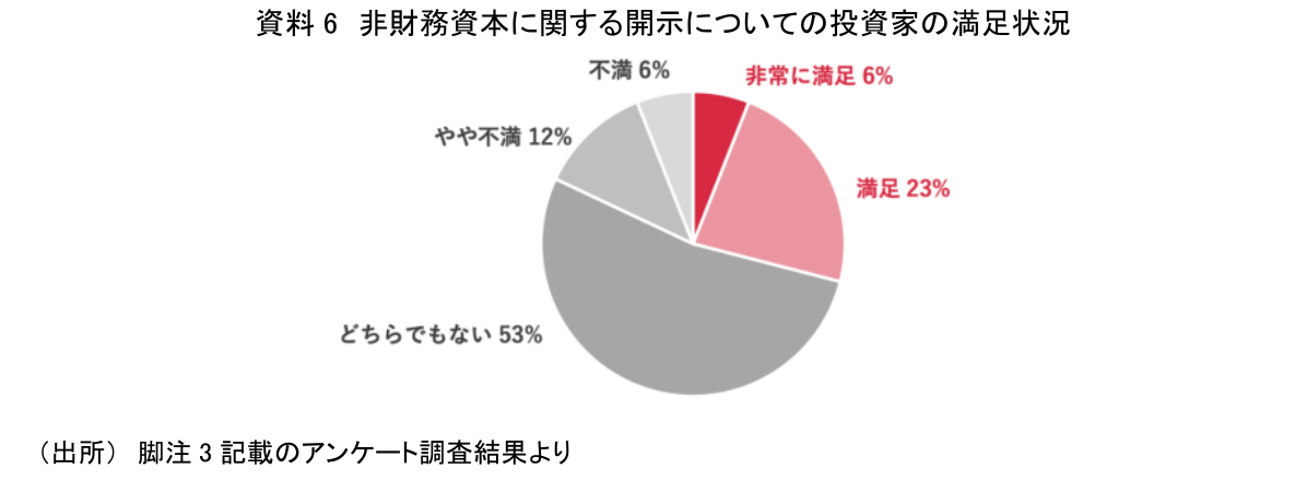 非財務情報は様々なステークホルダーに向けて開示される性格をもっているが、主たる利用者は投資家である。企業の非財務情報開示に対する投資家の意識調査(注3)によると、企業の非財務資本(注4)に関する開示について、満足している投資家は3割程度であり(資料6)、非財務情報開示の一層の充実が望まれる状況といえる。