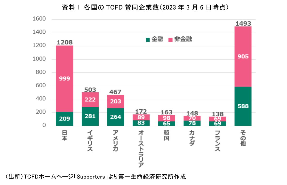 - 日本の大企業では、TCFD(気候変動対策の情報開示を求めるタスクフォース)への賛同企業数が欧米諸国を抑えて世界トップであるなど、気候変動への関心は高い。2023年9月にTNFD(生物多様性等の情報開示を求めるタスクフォース)提言の最終版の発表を控えていることもあり、今後ネイチャーポジティブに向けた動きが加速することが予想される。