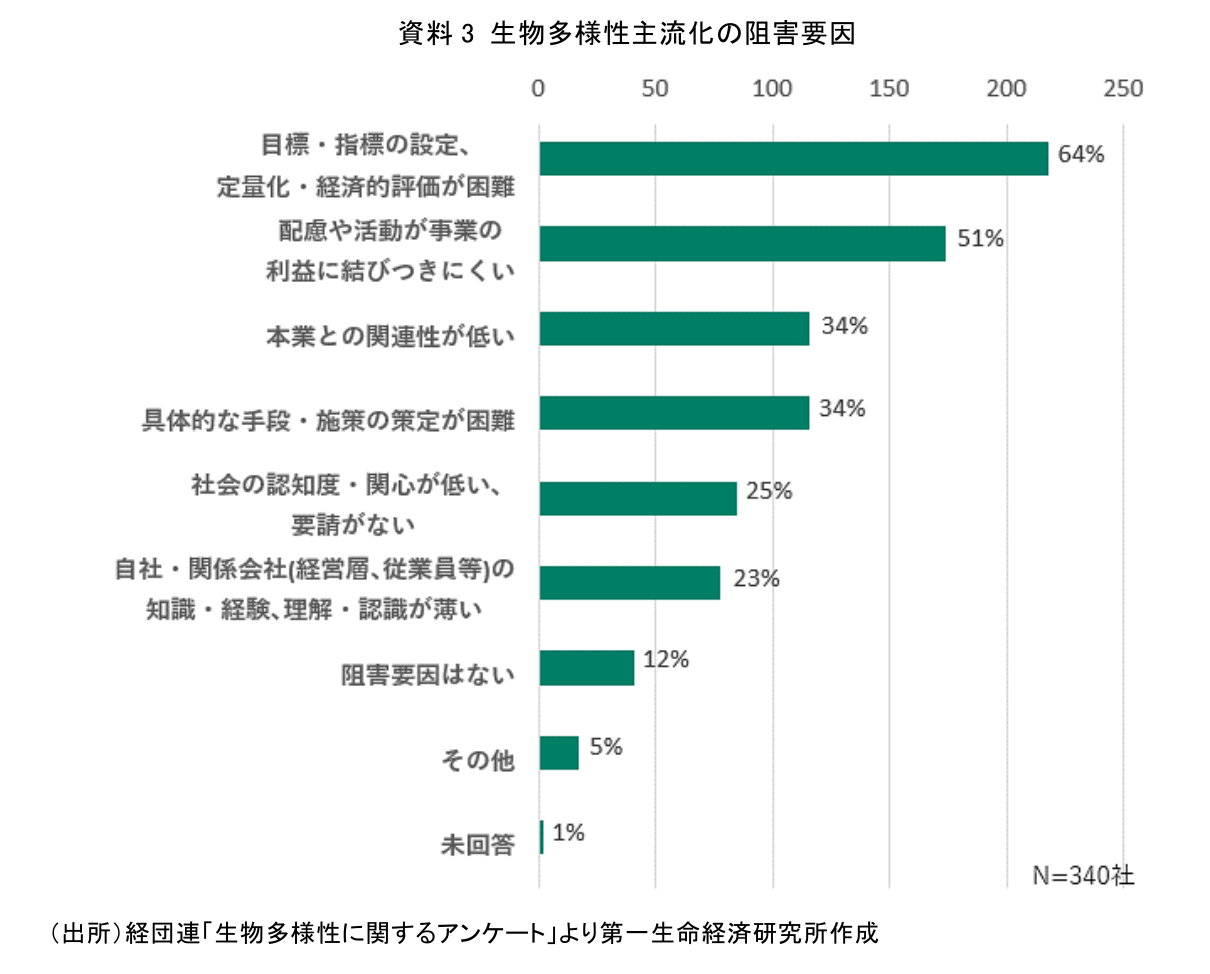 日本企業におけるネイチャーポジティブの取組状況を見ると、対応に苦慮する企業の様子が浮かび上がってくる。一般社団法人日本経済団体連合会(経団連)と経団連自然保護協議会による2019年の調査によれば、経営方針等に生物多様性保全の概念を盛り込んでいる会員企業の割合は2009年度の39%から10年で75%と約2倍に増加している。しかし、自社の活動が生物多様性に及ぼす影響について企業が把握できている範囲は「本社の事業活動」が57%、「グループ企業」が43%であり、「サプライチェーン(供給網)全体」まで把握できている企業は24%に留まる。また、生物多様性の主流化を進めるうえでの阻害要因としては、「目標・指標の設定、定量化・経済的評価が困難」、「配慮や活動が事業の利益に結びつきにくい」といったものが挙げられた(資料3)。生物多様性への関心が高まる一方で、リスクの把握が阻害要因となっていることが伺える。