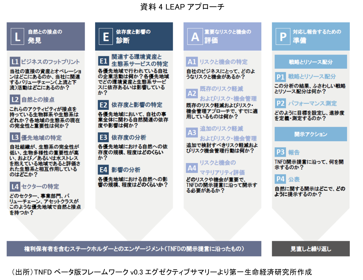 日本企業が自社の活動と生物多様性の接点を発見するために役立つアプローチとして、TNFDが推奨する「LEAPアプローチ」を紹介したい。「LEAP」とは、自然との接点の発見(Locate)、依存度と影響の診断(Evaluate)、リスクと機会の評価(Assess)、対応し報告するための準備(Prepare)という4つのフェーズの頭文字を取ったものだ(資料4)。