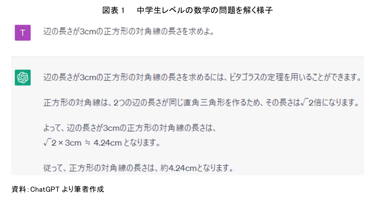 まず、基本的な問題に対する回答能力を確認すべく、中学生レベルの数学問題を作成し、生成AIに解かせてみた。1問目として「辺の長さが3cmの正方形の対角線の長さを求めよ」と生成AIに質問した。すると、生成AIはピタゴラスの定理を用いることができることを説明し、正解である「約4.24cm」という回答を出力した(図表1)。