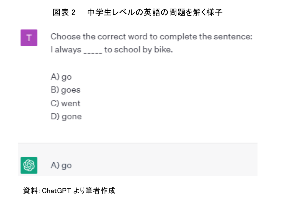 また、図表2に示すように、生成AIに中学生レベルの英語の問題として、文を完成させるための選択問題の解答を求めると、生成AIは正解となる選択肢「go」を選んだ。