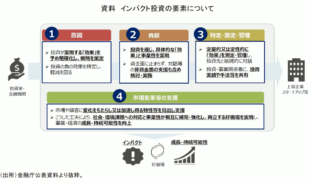 ここ数年でインパクト投資市場は急速に拡大し、投資手法の多様化も進んでいます。一方、「インパクト・ウォッシング」といわれる名ばかりの投資形態の増加の懸念が高まっています。インパクト投資の健全な発展に向け、原則や要件等の明確化が国際的にも進んでいます。我が国でも金融庁が2024年3月に「インパクト投資(インパクトファイナンス)に関する基本的指針」を策定・公表しました。この指針では、インパクト投資に期待される原則的・一般的要素を、①意図、②貢献、③特定・測定・管理、④市場変革等の支援の4つに纏めています(資料)。