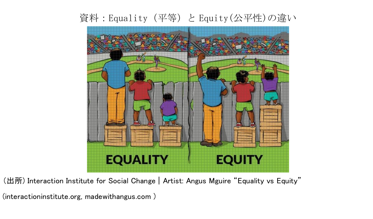 「正義」を理解するために、「平等」と「公平性」の違いを示す下のイラストをみてみましょう。左の「平等」では、野球の試合を見るため、幼児、子ども、大人に同じ高さの台が用意されていますが、幼児は壁に背が届かず観戦できていません。一方、右の「公平性」では、それぞれの背に合わせた台が用意されたことで、全員が観戦できています。「正義」はこの場合、壁自体を取り払うことで、全ての人が支援なく野球観戦できている状態を指します。