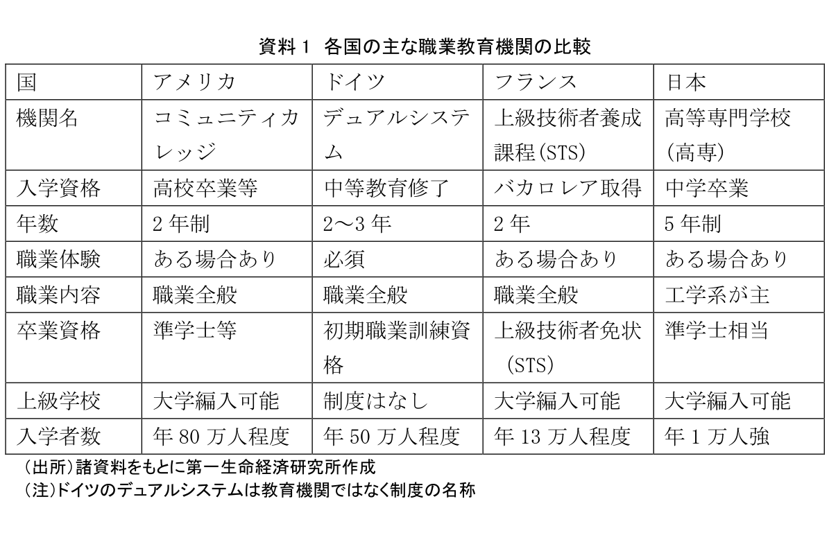 これまでシリーズとして、米国のコミュニティカレッジ、ドイツのデュアルシステム、および日本の高等専門学校についてその内容を紹介してきた。本レポートではその締め括りとして、フランスの職業系の学校(STS)についても適宜言及しながら、全体を俯瞰しての検討を行う。