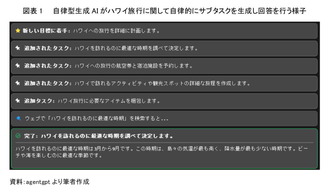 まず、「旅行」に関する自律型生成 AI の活用事例を確認する。タスクとして「ハワイ旅行の計画」を設定すると、自律型生成 AI は訪問時期、航空券と宿泊施設の予約、現地でのアクティビティと観光の詳細な旅程、旅行に必要なアイテムの梱包という 4つのサブタスクを自動生成する。そして、それぞれのサブタスクに対して回答を生成する。たとえば、最初に生成された訪問時期についての回答は「ハワイを訪れるのに最適な時期は 3 月から 9 月である。この時期は、島々の気温が最も高く、降水量が最も少ないため、ビーチや海を楽しむのに最適な季節である」と生成された(図表 1)。さらに、自律型生成 AI は航空券と宿泊施設の予約、現地でのアクティビティと観光の詳細な旅程、旅行に必要なアイテムの梱包についてもそれぞれ回答を自動生成した。