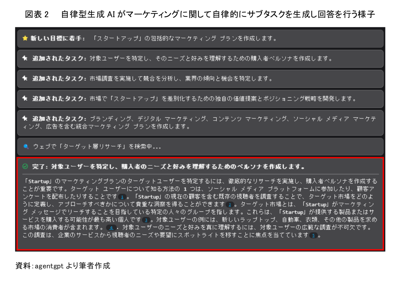 次に、「マーケティング」に関する自律型生成 AI の活用事例を確認する。タスクとして「スタートアップのマーケティングプラン」を設定すると、自律型生成 AI は顧客となる対象ユーザーの特定、市場調査・競合分析、独自の価値提案・ポジショニング戦略、ブランディング・多様なマーケティング手法という 4 つのサブタスクを自動生成した。そして、それぞれのサブタスクに対して回答を生成した。たとえば、最初に生成された対象ユーザーの特定に対する回答は、図表 2 赤枠の通り生成された。さらに、自律型生成 AI は、市場調査・競合分析、独自の価値提案・ポジショニング戦略、ブランディング・多様なマーケティング手法についてもそれぞれ回答を自動生成した。