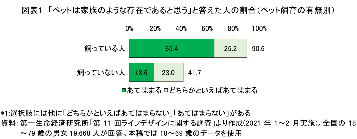 当研究所が行った調査によると、「ペットは家族のような存在であると思う」と答えた人(「あてはまる」「どちらかといえばあてはまる」の合計割合、以下同様)は、飼い主の約9割に及ぶ(図表1)。