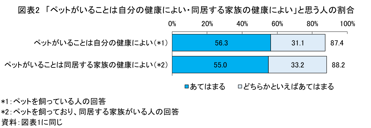 また、この調査で「ペットがいることは、自分の健康によい」と感じている人は、自身が健康な人だけでなく、自分の健康状態があまりよくないと感じている人にも確認される(図表省略)。自身や家族が心身に不調を抱えている場合を含めて、ペットがいることで、本人やその家族が心身の健康への好影響を感じているようだ。