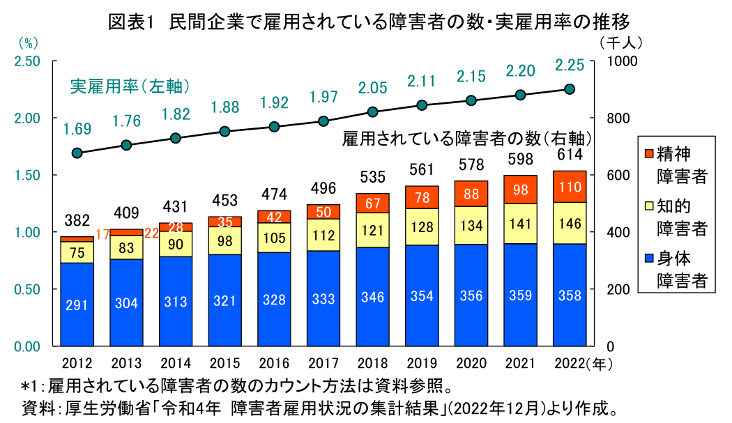 民間企業などで雇用される障害者は年々増加している(図表1)。その一因は、障害者雇用促進法の「障害者雇用率制度」にある。