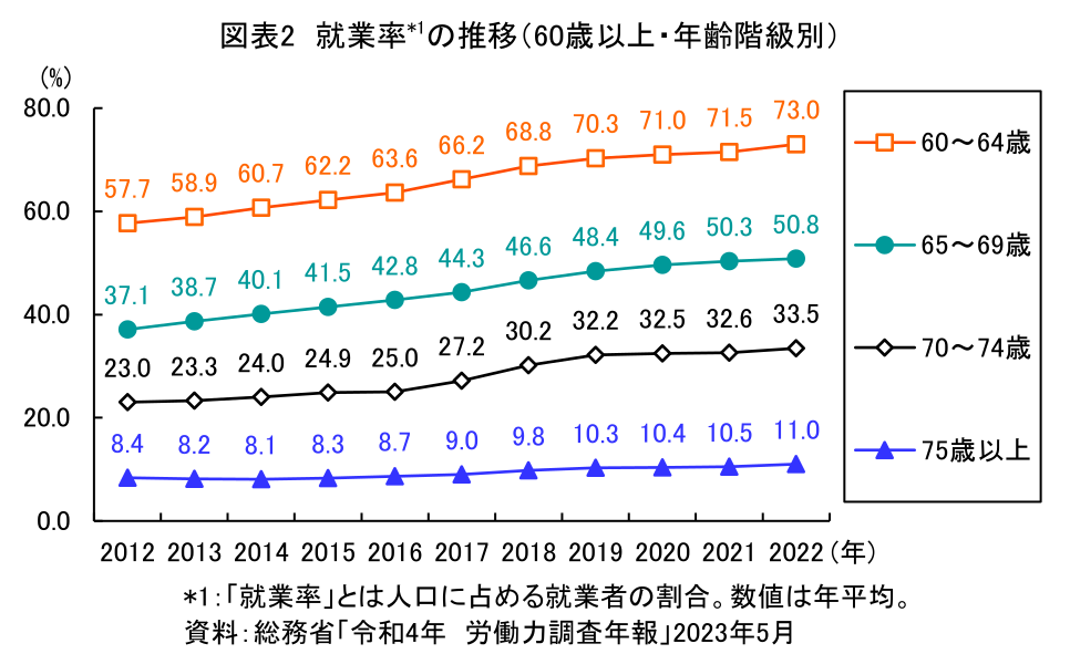 60歳以上の人の就業率はこの10年間でほぼ増え続けている(図表2)。2022年現在、60~64歳では73.0%、65~69歳では50.8%、70~74歳でも33.5%が働いている。プレゼンにおいて年齢の高い人に情報を伝えるためには、加齢による視覚・聴覚などの機能低下(たとえば老眼や白内障、加齢性難聴)への対応が必要である。