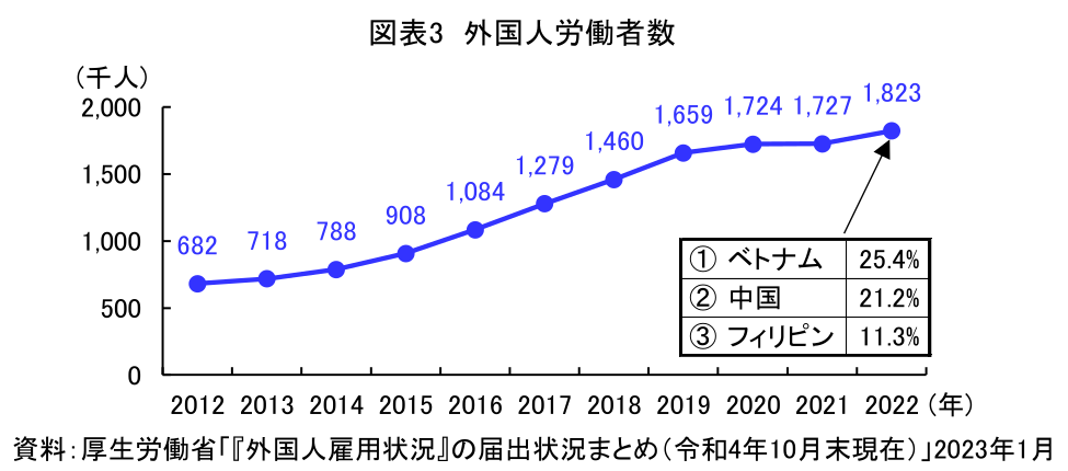 日本で働く外国人も年々増加している。コロナ禍により2020年以降は伸びが鈍化したものの、2022年には過去最高の182万人を記録した(図表3)。国籍別ではベトナム、中国、フィリピンの順に多い。