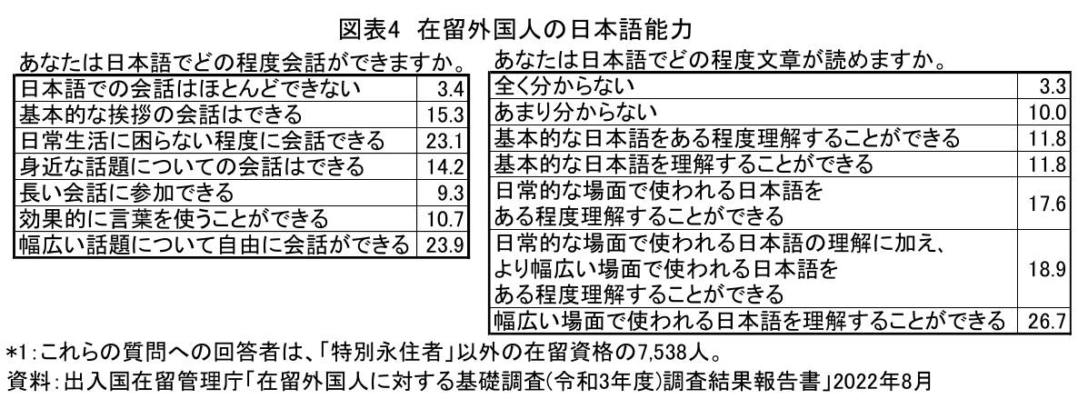 図表4は、在留外国人(日本に住む外国人)の日本語能力の自己評価である。日本語でのプレゼンを見聞きする際に必要と思われる「長い会話に参加できる」以上の会話能力や「日常的な場面で使われる日本語の理解」より高い読解力がある人は、全体の半数に満たない。在留外国人に対して日本語でプレゼンをおこなう際には、その聴解力・読解力に応じた話し方や資料・画面作成をする必要がある。