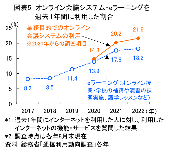 総務省の調査によると、1年間に業務目的でオンライン会議システムを利用した割合は、コロナ禍初期の2020年の14.8%から2年間で急増し、2022年には21.6%となった(図表5)。特に、男性30~50代におけるその割合は約4割にのぼっている(図表省略)。またeラーニングを利用した割合も、2017年から2022年の5年間に10ポイント増え、18.2%となった。
