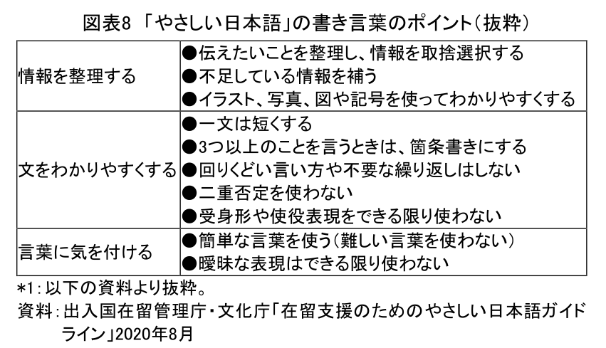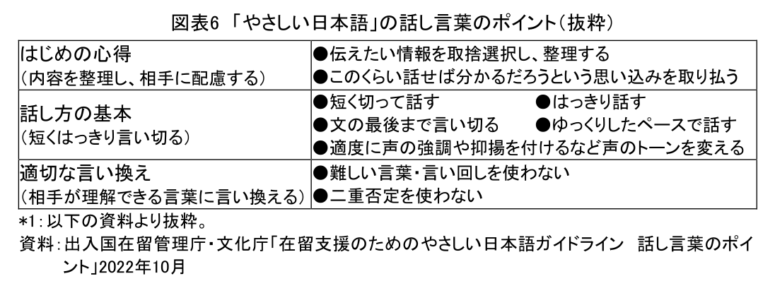 だが、外国人だけでなく日本人(日本語を母語とする人)、特に音声が聞こえにくい人(難聴者)、知的障害のある人、音声を中心に情報を得ている視覚障害者などに伝える際にも、やさしい日本語は役立つ。たとえば、図表6の「話し言葉のポイント」にもあるように、話の「内容を整理」し、短くはっきり言い切るなどの「話し方の基本」を守り、「適切な言い換え」をおこなうことは、日本人の聞き手に対しても有効だろう(注6)。