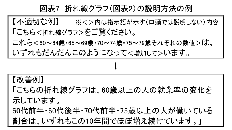 スクリーン・画面に映し出された画像を見ることが難しい視覚障害者などに対しては、上記①以外の話し方の配慮も重要である。たとえば、画像を見せながら話す際は、「これ」「ここ」「この」などの指示語だけでなく、指示するものが何かを具体的に言葉で説明することが重要である。図表7は、前述の図表2のグラフを口頭で説明する場合の例である。これらの話し方は、オンラインでのプレゼンで、画面の情報が伝わりにくい際(たとえば、技術的なトラブルにより共有画面がうまく見られない場合など)にも役立つ。