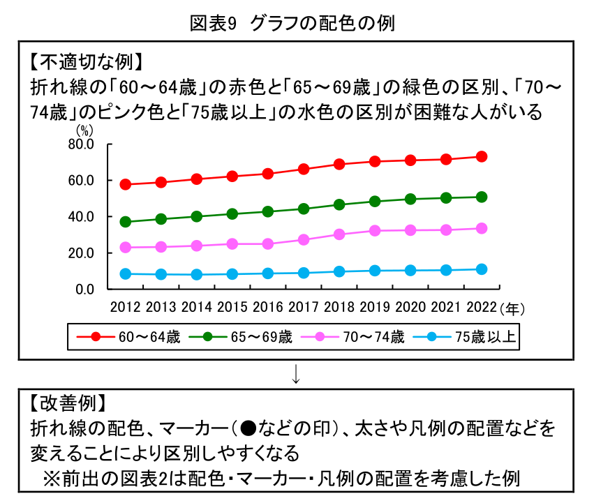 たとえば色覚の多様性に関しては、一般的な色覚と異なる人が日本人男性の5%(20人に1人)、女性の0.2%(500人に1人)ほどいるといわれている。にもかかわらず、プレゼンにおける色の見分けやすさに対する配慮は、必ずしも十分ではない。だが、一部の配色を変える、形状や文字など色以外の要素で区別できるようにするなど、比較的簡単な方法で見分けやすさを改善できることも多い(図表9の例を参照)。まずは色の見分けやすさを考慮する必要があるという意識が社会で高まること、そしてどう対応したらよいかという知識が普及することが望まれる(注7)。
