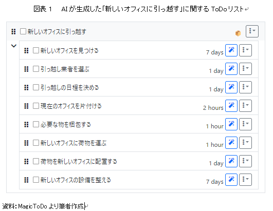 まず、「新しいオフィスに引っ越す」について、ToDoリストAIに指示を出し、タスクの詳細度合いを設定して実行すると、ToDoリストが生成された。ToDoリストの詳細度合いが最低レベルの設定でタスクを生成したところ、8項目のリストが出力された。一方、詳細度合いを最高レベルとしてタスクを生成すると、20項目のリストが出力された。さらに、AIは出力された各項目に要する時間も計算した。利用者は、AIが推薦する項目を順に実行していくだけである(図表1)。また、ToDoリストAIが生成したリスト内容を変更したい場合、自由にリストの編集を行うこともできる。
