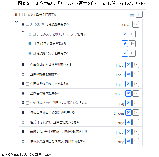 次に、「チームで企画書を作成する」について、ToDoリストAIに指示したところ、最低レベルのリスト生成設定で10項目、最高レベルでは33項目のリストが生成された。また、たとえば出力された「チームメンバーと意見を共有する」という項目について詳細化を指示したところ、細分化した3項目のリストが追加で生成された(図表2)。