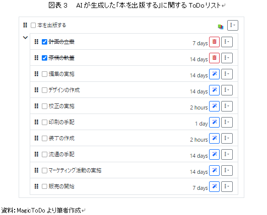 さらに、「本を出版する」についてToDoリストAIに指示したところ、最低レベルのリスト生成設定で10項目、最高レベルでは、25項目のリストが生成された。リスト項目をすべて完了した場合、完了チェックを行うと、ToDoリストでの進捗状況が可視化された(図表3)。