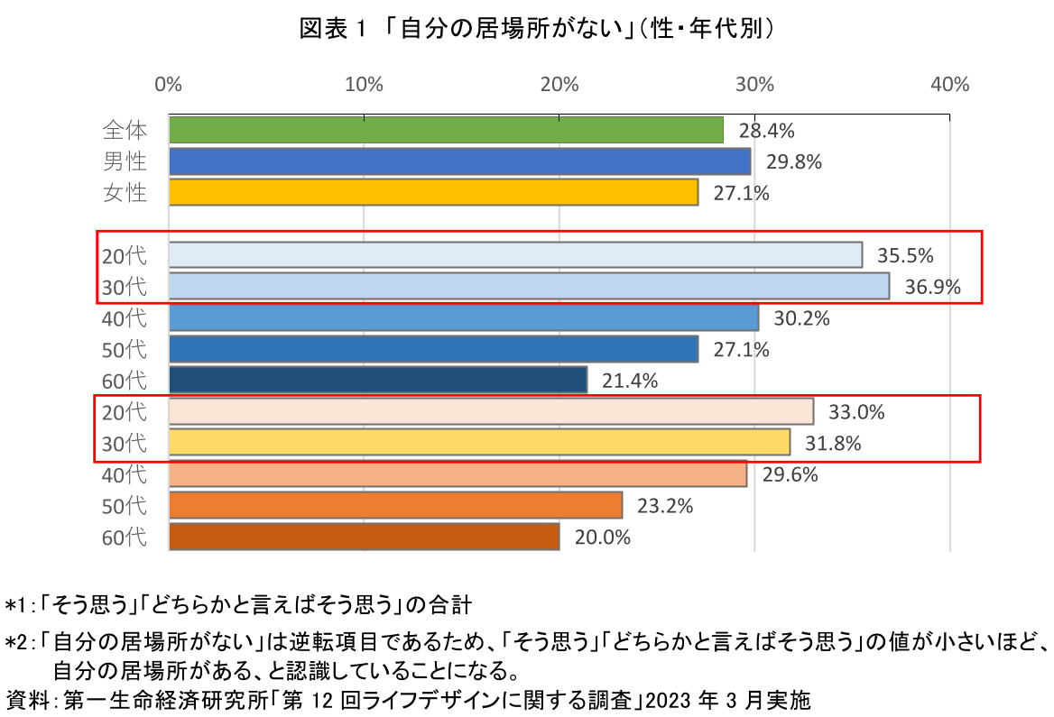 図表1は、「自分の居場所がない」という設問について、全体、性年代別に示したものである。性別で見ると、男性の方が女性よりも高い割合を示している。年齢別では男女共に、年齢が若いほど「居場所がない」と回答する割合が高く、年齢が上がるほど低くなっている。男性の20、30代では35%を超え(20代35.5%、30代36.9%)、女性も20代33%、30代31.8%と、若い層の約3分の1が「自分の居場所がない」と回答している。
