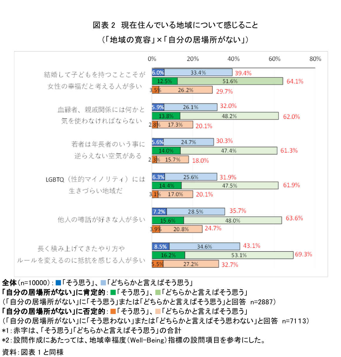 結果をみると、「自分の居場所がない」と感じている層(横棒グラフ緑色)は、居場所があると感じている層(横棒グラフオレンジ色)と比べ、地域の寛容についても否定的に捉える傾向にあることがわかる。その差をみると、「そう思う」は5ポイント以上、「どちらかと言えばそう思う」は20ポイント以上である。全体の割合と見比べてもその差は明確である(図表2)。