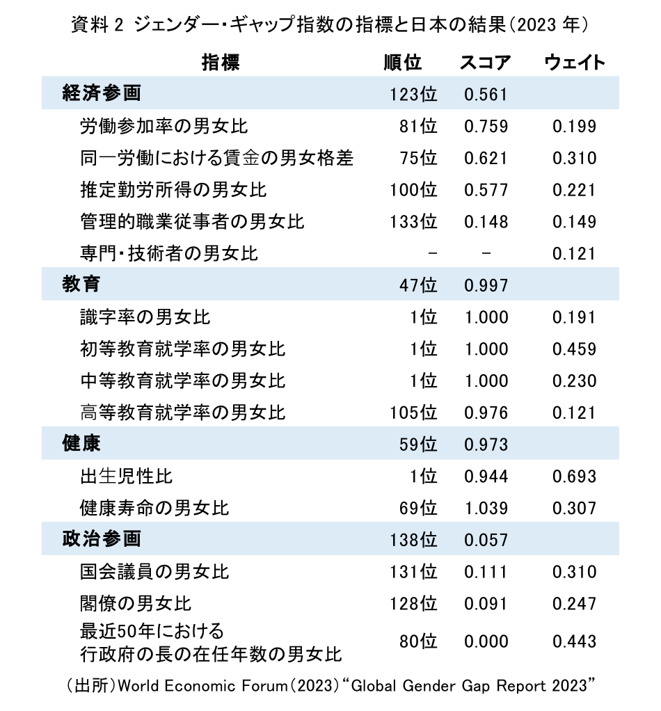この順位は、経済参画・教育・健康・政治参画の4つの分野で、データに基づいた計14の指標を総合評価したものである(資料1)。0が完全不平等、1が完全平等を表している。分野別に見ると、経済参画と政治参画が日本の低順位の要因といえる。