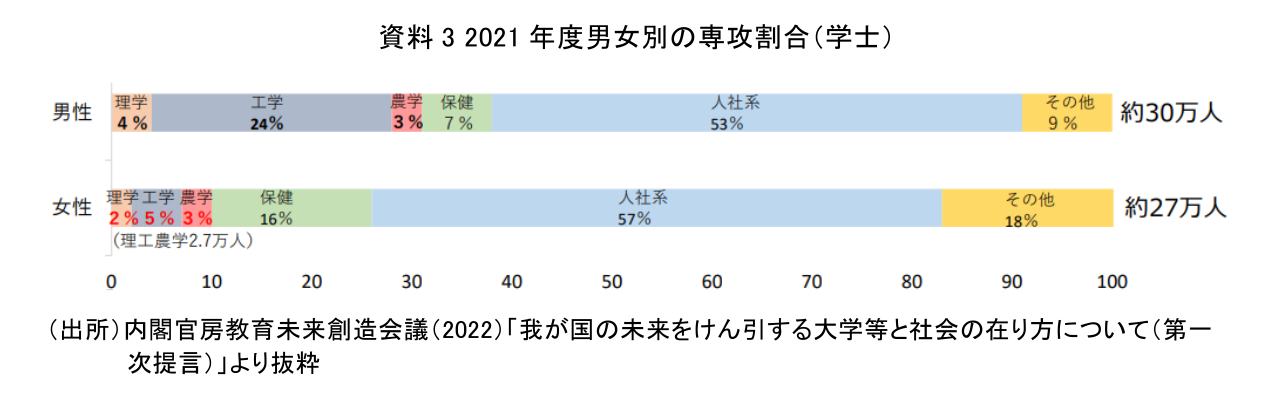 これらの要因の一つとして、大学院進学や研究者を選択する人が多い理工系学部への女性進学率が低いことがある。資料3のとおり、男性の学部進学者のうち、理工系(理学部+工学部)の割合は28%(約8.4万人)だ。一方、女性は約7%(約1.9万人)と、OECD平均の15%よりも大幅に低い。