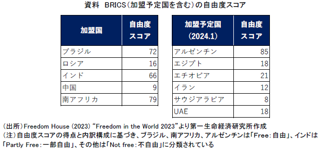 他方で、自由で開かれた国際秩序といった価値観を共有するG7などとは異なり、加盟国は一枚岩から程遠いのが現状です。例えば、政治体制を映す自由度スコアは二極化しています(資料)。