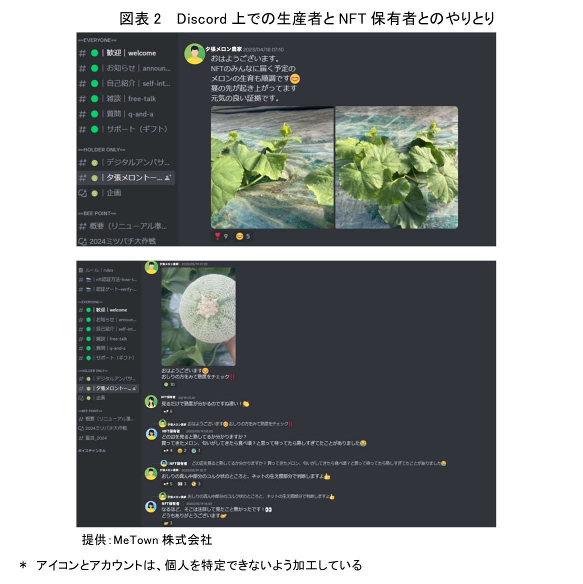 NFT保有者が参加するDiscord上のコミュニティでは、生産者がNFT保有者からの質問に答えたり、定期的にメロンの生育状況を報告したりする。作り手にとってはたわいもない日常の出来事だが、多くのNFT保有者はメロンの生育過程を知らない。Discord上のコミュニティでは、こうした生産者の日常を共有し、やり取りすることが当たり前のように行われている。