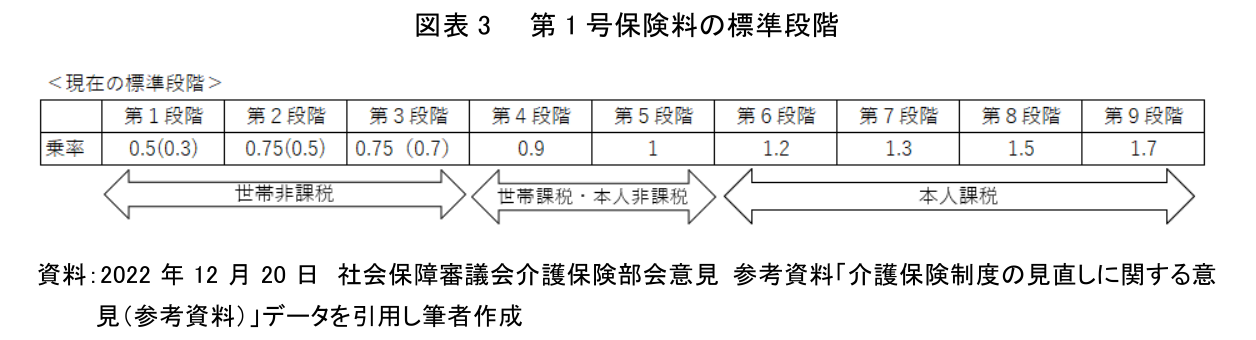 第1号保険料は、制度創設時から所得段階別保険料となっており、国が定める標準設定は当初は5段階であった(第3段階を基準額とし、第1・2段階は基準額以下、第4・5段階が基準額以上。乗率は0.5~1.5)。図表3の通り、2015年の制度改正の際に9段階(第5段階が基準額。乗率0.5(0.3)~1.7)に見直されている。各市町村は事情に応じてアレンジすることができ、半数以上の市町村が10段階以上で設定している。たとえば、東京23区で最高乗率、最高保険料共に最も高い渋谷区の場合、16段階に区分されており、基準額は年間71,520円(月額5,960円)と全国平均よりも低いが、第1段階が年間17,900円(月額約1,500円)(乗率は基準額の0.25)、第16段階は年間429,100円(月額35,780円)(乗率は基準額の6.0)となっている。同区の実情に合わせて、より負担能力を反映できる仕組みにしているようである。