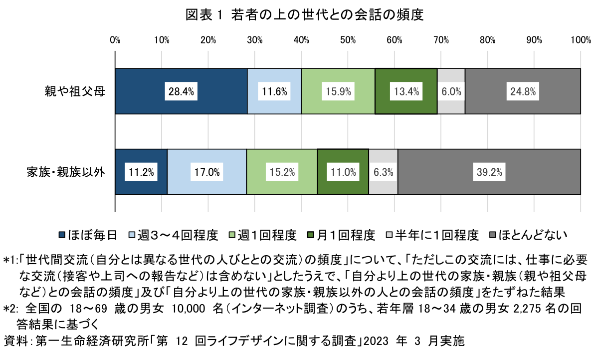 図表1は、若齢層(18~34歳)が上の世代と会話をする頻度のグラフである。半数以上の若者が、親や祖父母などの親族と週1回程度以上の会話をしている。対して、家族以外の上の世代の人との会話(ここには、接客や業務上の報告は含まれない)は、「ほとんどない」と回答する人が39.2%と最も多かった。もちろん、職場や地域には、色々な世代の人がいるだろうが、世代をまたいでのコミュニケーションは日常的にあまり行われていないようだ。