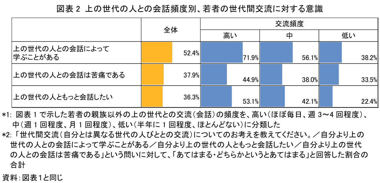 図表2は、若者に「自分より上の世代との交流」に対する意識をたずねた結果である。半数以上の若者が、「上の世代の人との会話によって学ぶことがある」と回答しており、中でも、日常的に交流をしている人(交流頻度高:「ほぼ毎日」「週3~4回程度」の合計)では7割におよぶ。一方で、「上の世代の人との会話は苦痛である」と回答する割合も、交流頻度の高い人のほうが高く(44.9%)なっている。日常的に上の世代と接している若者の実感として、その会話は、学びがある反面、苦痛も伴うという二面性があることがうかがえる。