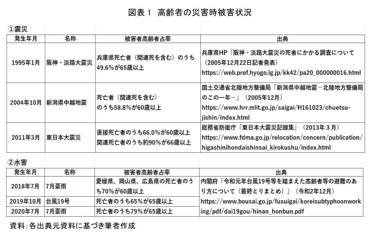 過去の大きな災害においては、人的被害に高齢者の占める割合が非常に高い傾向にある(図表1)。その原因は、身体能力の低下、判断能力の低下、情報収集の困難さ、事前の準備不足、社会的孤立等多岐にわたる。高齢化の進行に伴い、高齢者のみ世帯、高齢者単独世帯等、平時での防災・減災対策(以下「災害対策」)および発災時の避難行動等への対応力に不安がある世帯が今後も増えていく。