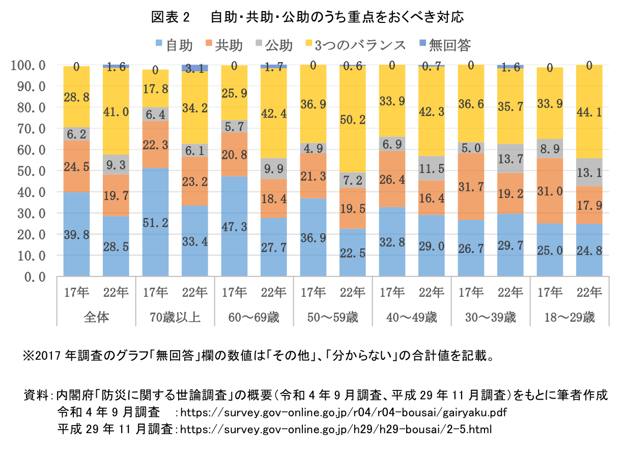 内閣府「防災に関する世論調査」(2017年11月・2022年9月調査)(注3)によると、発災時に「自助、共助、公助のうち、重点をおくべき対応」として、「自助」「共助」を挙げる人の割合が低下し、「3つのバランス」とする人が増えている(図表2)。年代別にみると、特に自助の割合低下は50代以上、共助の割合低下は40代以下で顕著である。