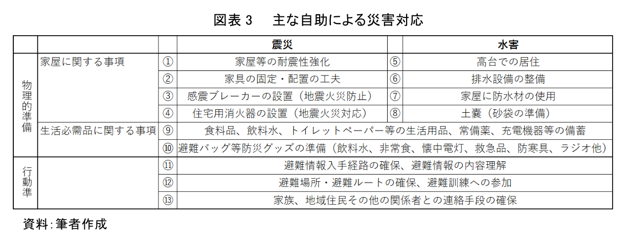 平時に行うべき自助による災害対策に関する情報は、行政あるいは民間事業者から様々な媒体を通して発信されている。主な項目について「生活の場における物理的な準備」、「発災時における行動の準備」に分けて図表3に一覧化した。