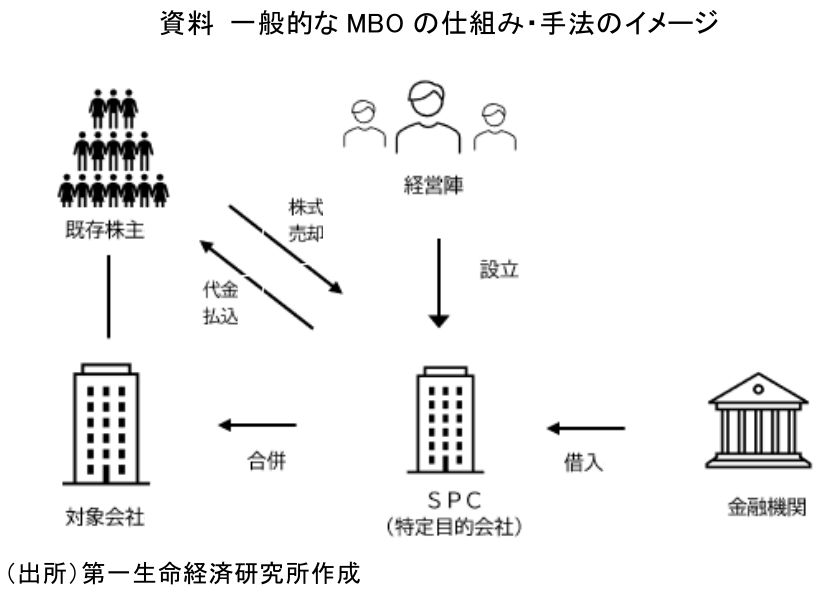 MBOはManagement Buyoutの略で、経営陣が自社の株式、或いは一部の事業部門を買い取り、その経営権を取得することを指します。上場、非上場を問わず、株式会社で行われ、特に上場会社の場合、公開買付け(TOB : Takeover Bid)を伴い、その会社は非上場となります。SPC(特定目的会社)を設立し、金融機関から買付けに必要な資金を調達し、買収後、SPCと当該会社を合併させる手法が一般的です(資料)。