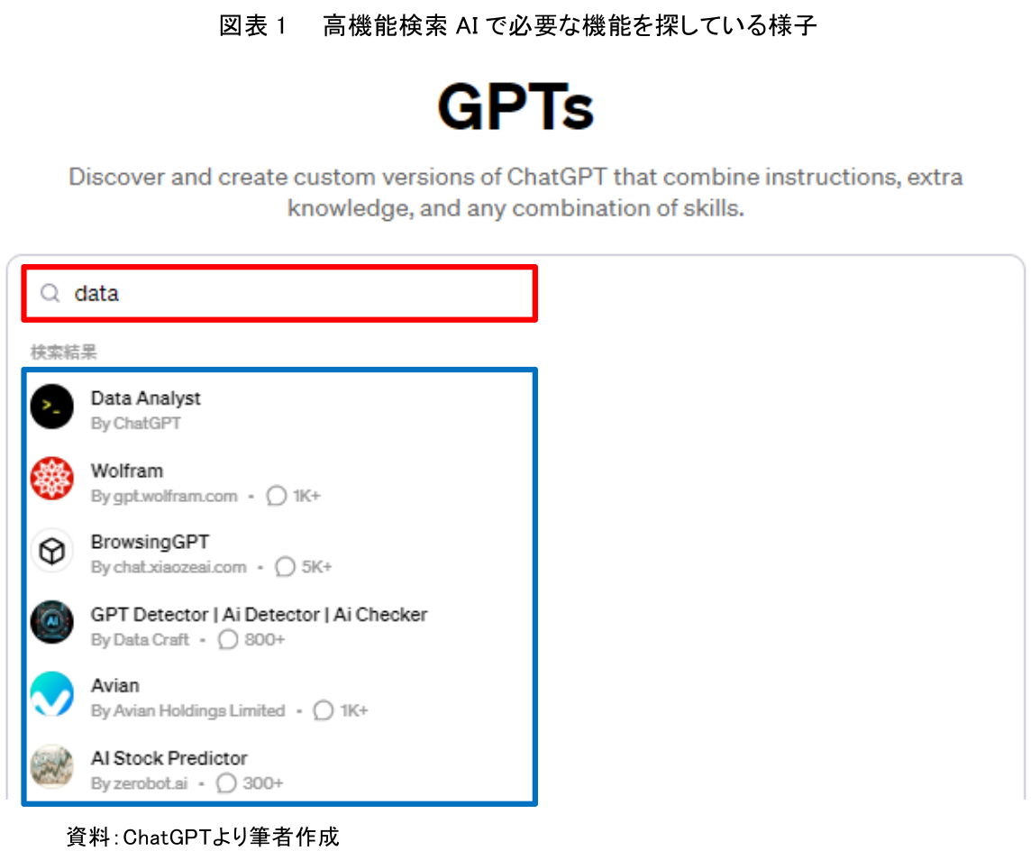 では3つの特徴について、高機能生成AIを利用できる点からみていこう。高機能生成AIの利用ページでは、自分の仕事に必要なAIを検索できる機能が提供されている。たとえば、仕事においてデータ分析をしたい場合、検索窓に「data」と入力すれば(図表1の赤枠)、関連する高機能生成AIがプルダウンで表示され、クリックすればすぐに利用開始できる(図表1の青枠)。