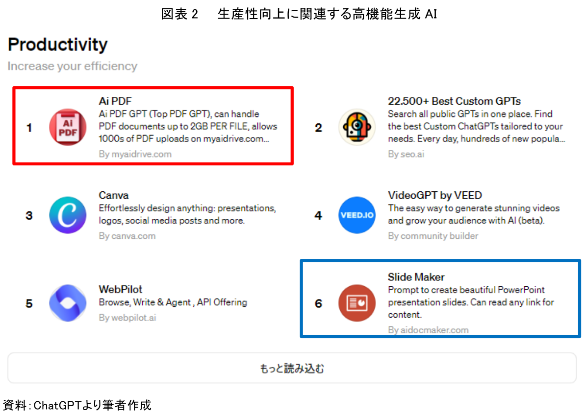 また、このページでは、人気のAI、画像生成、文章生成、生産性向上、調査・研究、プログラミング、教育、ライフスタイルといった主要カテゴリー別に、実務に役立つ高機能AIが整理され、わかりやすく表示されている。利用者は仕事の用途に応じてカスタマイズされたAIを利用できる。たとえば、生産性向上の項目に表示されている生成AIの一覧には、複数のPDFをアップロードして、そのPDFの内容を要約したり、膨大なPDFコンテンツの中から必要な情報を抽出できるAIや(図表2赤枠)、見栄えの良いPowerPointのスライドの作成を対話形式で生成できるAIが提供されている(図表2青枠)。